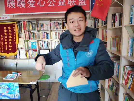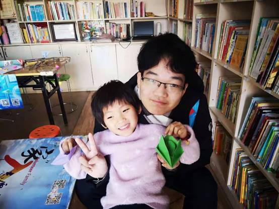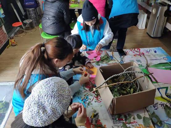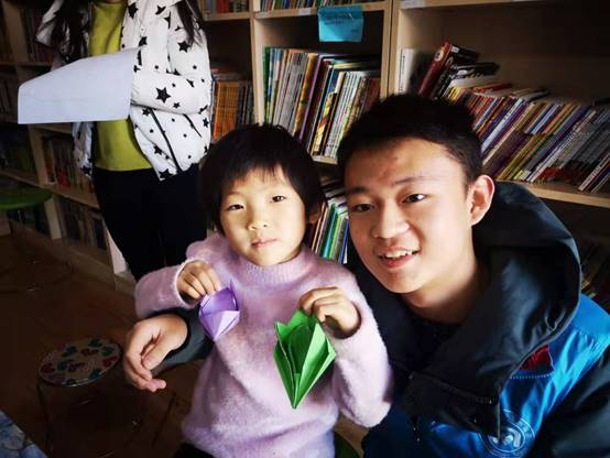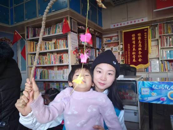 (小朋友拿着自己做好的吊饰,和志愿者拍照)