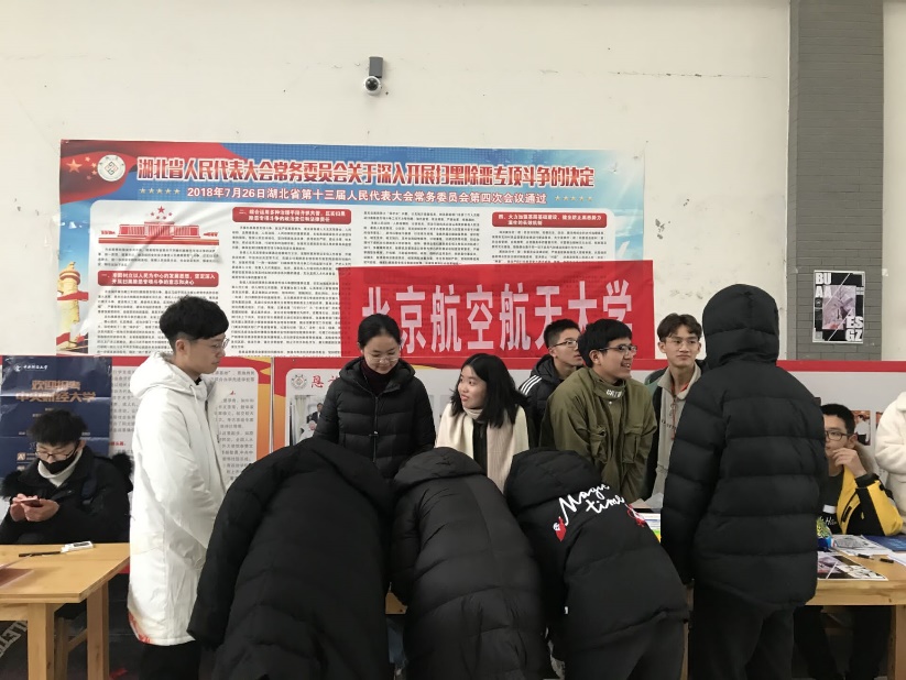 他们早早地就开始了着手准备,提前与母校联系,确定了宣讲时间,他们还购买了北航明信片,自行设计制作了海报和横幅,用来吸引学弟学妹们。然后在1月13日当天,负责布置场地的同学早上八点就来到了进行宣传的地点,为他们占据了一处地理位置优越的场地。他们将学校发的宣传手册和用来统计学弟学妹们的信息的表格放在场地上以方便学弟学妹们查看,而他们则在一旁随时为学弟学妹们解答疑惑,宣传北航。宣讲过程中,有许多学弟学妹们前来提问,他们一一做出了解答。
